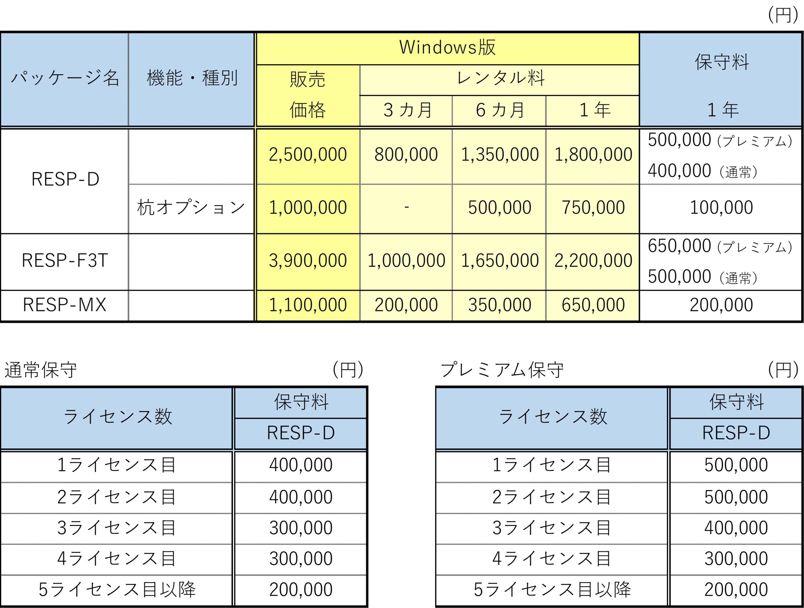 価格表 ※保守料は1ライセンスあたりの金額です。 ※販売価格は2026年4月1日以降のものです。2026年3月31日までの販売価格についてはこちらよりお問い合わせください。 技術サポートの「プレミアムプラン」について RESPを日常的に利用されているユーザー様をより強力にバックアップするため、2026年4月1日より技術サポートの「プレミアムプラン」を開始します。 プレミアムプランの特典 限定のツール、資料を定期配布(例:解析結果の集計プログラム, 可視化プログラム) インハウスセミナーを年1回無償で開催 バッチ実行機能による外部プログラム連携に関する問い合わせ対応(例 : RESP-D Scriptの仕様に関するご相談など) 電話によるユーザーサポート対応