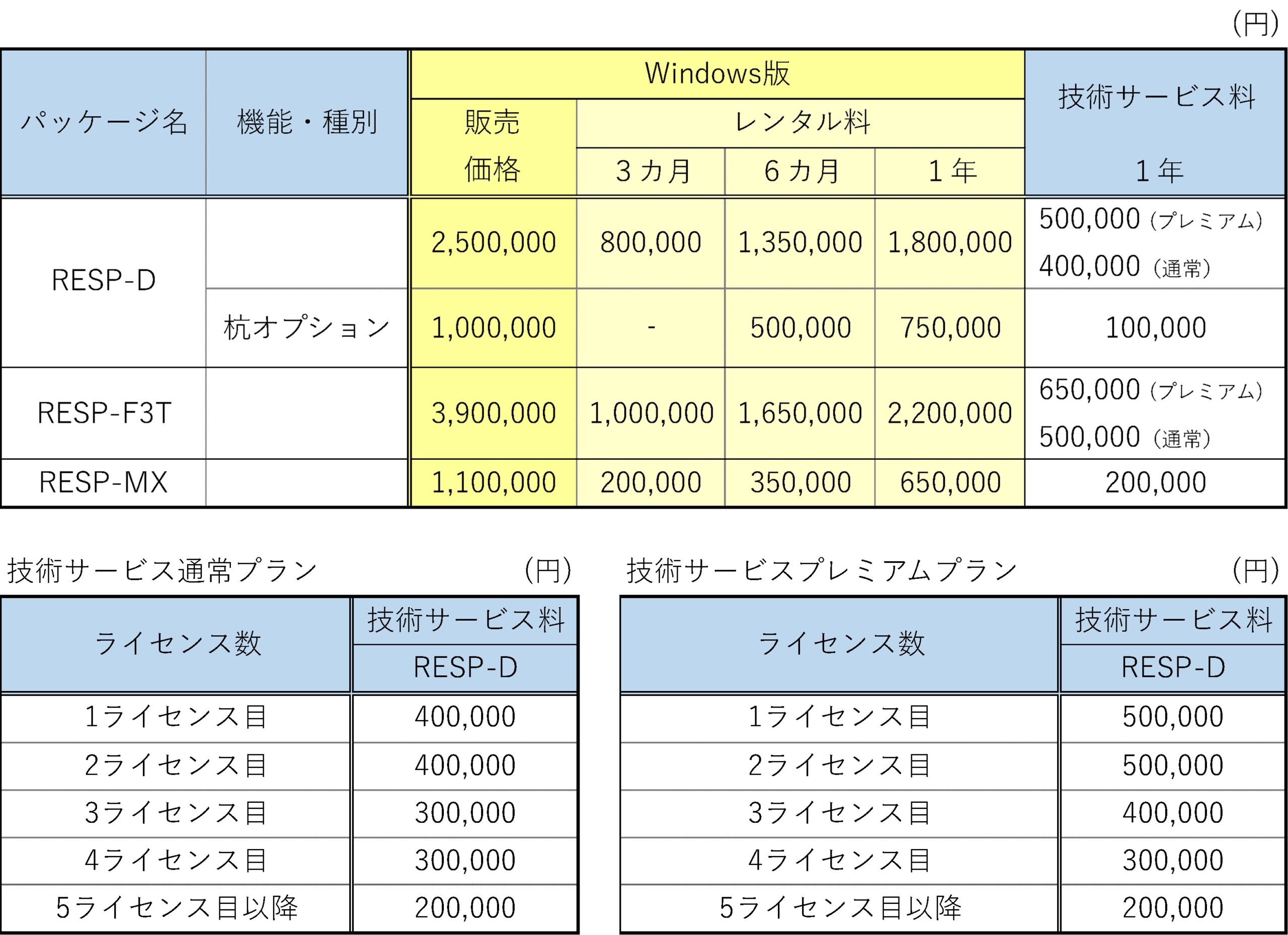 価格表 ※技術サービス料は1ライセンスあたりの金額です。 ※販売価格は2026年4月1日以降のものです。2026年3月31日までの販売価格についてはこちらよりお問い合わせください。 技術サービス 通常プラン ●対象ソフトウェアの質疑応答サービス データ入力、計算実施、計算結果出力の作業範囲で生じる技術的な質問に、できる限り早急に回答します。 ただし、質問および回答は、原則として電子メールを利用するものとし、弊社営業日の9:00~18:00に限定します。 ●対象ソフトウェアのアップデートサービス 技術サービス契約期間中、対象ソフトウェアがアップデートされた場合には、無償で対象ソフトウェアの最新版を提供します。 プレミアムプラン RESPを日常的に利用されているユーザー様をより強力にバックアップするため、2026年4月1日より技術サービスの「プレミアムプラン」を開始します。 通常プランに加え、以下の特典をご利用いただけます。 ●限定のツール、資料を定期配布 (例:解析結果の集計プログラム, 可視化プログラム) ●インハウスセミナーを年1回無償で開催 ●バッチ実行機能による外部プログラム連携に関する問い合わせ対応 (例 : RESP-D Scriptの仕様に関するご相談など) ●電話によるユーザーサポート対応